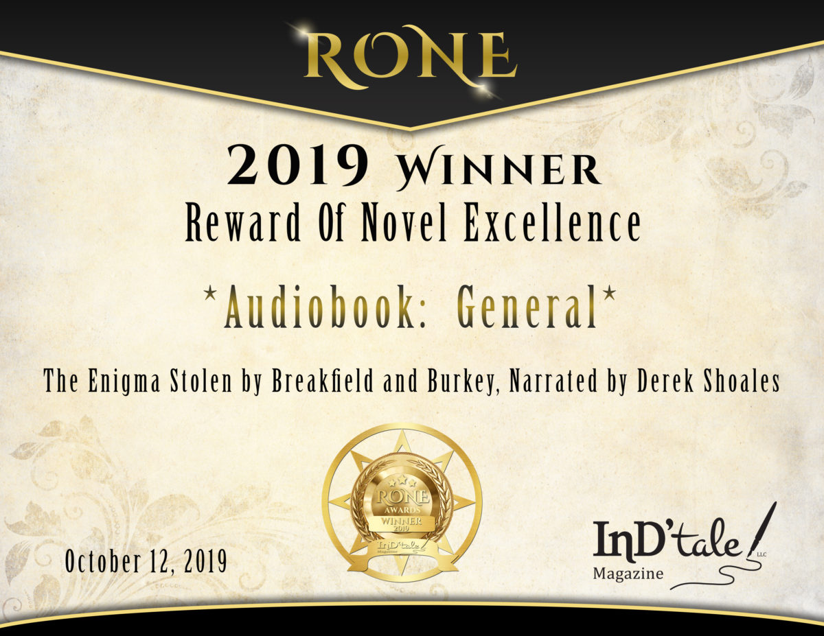 I was shocked and excited to find out that we’d won the Audiobook: General category of the 2019 RONE Awards on Saturday 10/12! The book that won it for us was The Enigma Stolen, Book 5 in the Enigma Series.